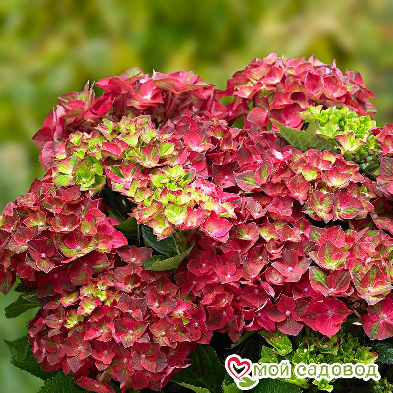 ГОРТЕНЗИЯ КРУПНОЛИСТНАЯ Royal Red — не высокий, пышный, лиственный кустарник шаровидной формы с красными цветами (в начале цветения имеют зеленую серединку), собранными в роскошные шапки до 15 см в диаметре, на фоне темно-зеленых листьев.